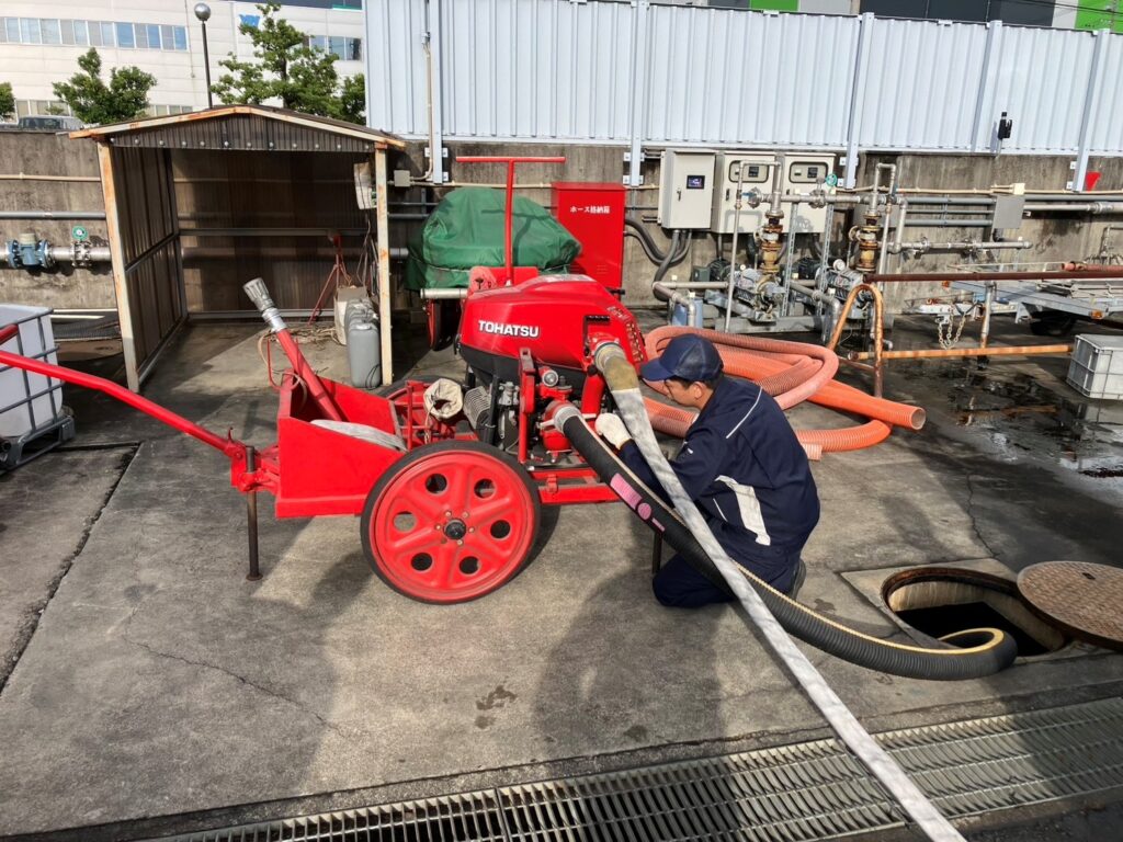 ホースの点検兼連結手順の再確認、放水方法の実習を行いました。